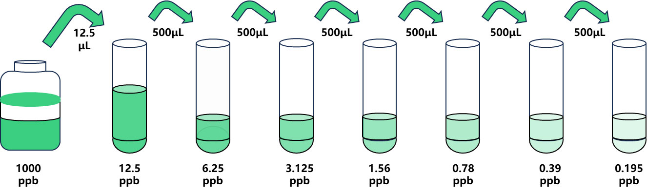 试剂盒中取出标准品,准备7个试管,先将1000ppb标准品(200µL)按需吸取一定量用1×稀释液稀释至12.5ppb(例:12.5µL的标准品母液+987.5µL的1×稀释液,制备得到1000μL的12.5ppb浓度标准品),随后在7个试管中分别加入500μL的1×稀释液,在这7个单独的试管中将12.5ppb标准品依次2倍倍比稀释至7个梯度,共配制7个浓度的标准品,依次为:12.5ppb、6.25ppb、3.125ppb、1.56ppb、0.780ppb、0.390ppb、0.195ppb,从最高浓度标准品溶液中吸取500μL标准品到下一个试管中,轻轻吹打混匀,以此类推进行标准品的倍比稀释(如图所示),1×稀释液用作零浓度标准品(0ppb)。