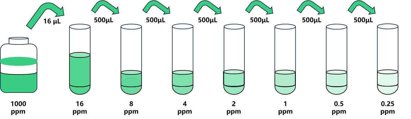 试剂盒中取出标准品,准备7个试管,先将1000ppm标准品(200µL)按需吸取一定量用1×稀释液稀释至16 ppm(例:16µL的标准品母液+984µL的1×稀释液,制备得到1000μL的16ppm浓度标准品),随后在6个试管中分别加入500μL的1×稀释液,在这6个单独的试管中将16ppm标准品依次2倍倍比稀释至6个梯度,共配制7个浓度的标准品,依次为:16ppm、8ppm、4ppm、2ppm、1ppm、0.5ppm、0.25ppm,从最高浓度标准品溶液中吸取500μL标准品到下一个试管中,轻轻吹打混匀,以此类推进行标准品的倍比稀释(如图所示),1×稀释液用作零浓度标准品(0ppm)。