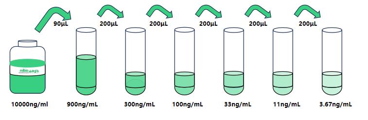 试剂盒中取出标准品,准备7个试管,先将10000ng/mL标准品(200μL)按需吸取一定量用1×稀释液稀释至900ng/mL(例:90µL的标准品母液+910的1×稀释液,制备得到1000μL的900ng/mL浓度标准品),随后在5个试管中分别加入400μL的1×稀释液,在这5个单独的试管中将900ng/mL标准品依次3倍倍比稀释至5个梯度,共配制6个浓度的标准品,依次为:900ng/mL、300ng/mL、100ng/mL、33ng/mL、11ng/mL、3.67ng/mL,从最高浓度标准品溶液中吸取200μL标准品到下一个试管中,轻轻吹打混匀,以此类推进行标准品的倍比稀释(如图所示),1×稀释液用作零浓度标准品(0ng/mL)。