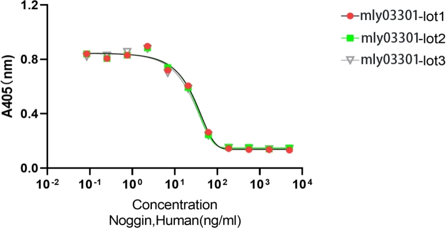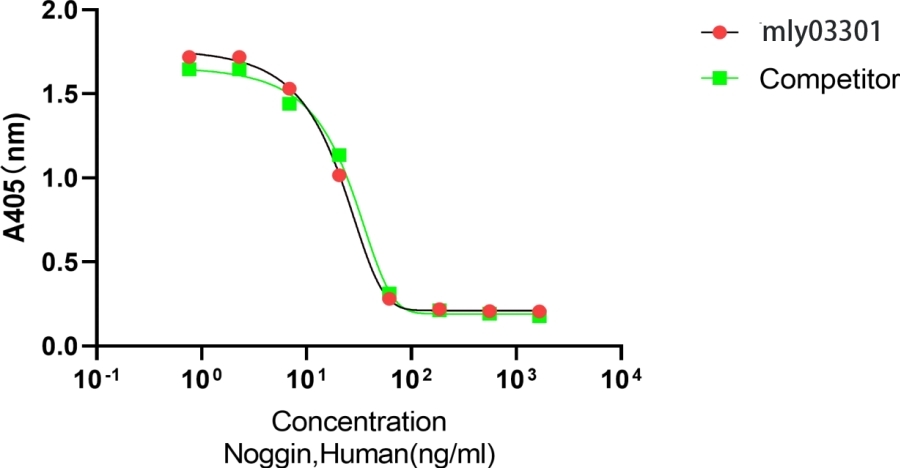 Measured by its ability to inhibit 5.0 ng/mlof BMP-4 induced alkaline phosphatase production by ATDC-5 chondrocenic cells.  The  activity  of  Recombinant  Human  Noggin  ( Cat  mly03301) is  equivalent  to competitor.