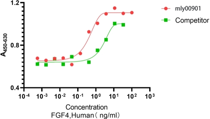 Recombinant Human FGF4 (Cat. No. mly00901) stimulates proliferation of NIH3T3  cells. The  ED50   for this  effect  is 0.25-1ng/mL. The activity of mly00901 was higher than the other competing product.
