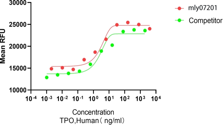 Measured in a cell proliferation assay using Mo7e cells. The ED50  for this effect is  ≤1.0 ng/mL. The activity of  mly07201 was higher than other competing products.