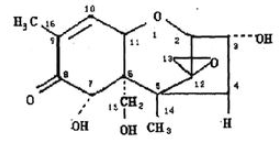 呕吐毒素为白色针状结晶,熔点为151 ~153℃(醋酸乙基石油)。不饱和酮基的存在使得其在短波紫外下有吸收峰,但与许多其它物质在此处的紫外吸收峰相重叠,属非特征性的。紫外辐射下不显荧光。DON易溶于极性的溶剂如水、甲醇、乙醇、乙腈、丙酮和乙酸乙酯,不溶于正已烷、丁醇、石油醚。