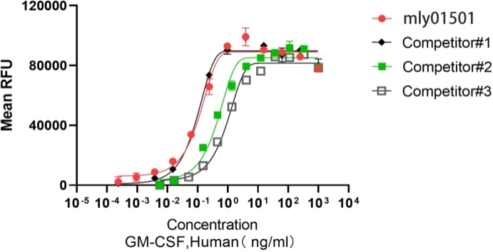 Recombinant Human GM-CSF (Cat. No. mly01501) stimulates proliferation of TF-1 cells.