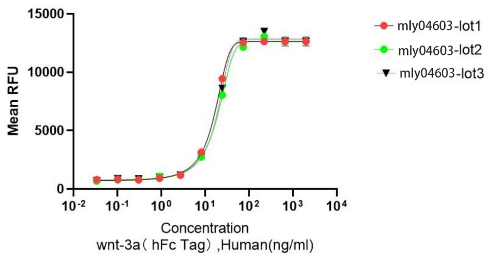 Measured by its ability to induce Topflash reporter activity in CHO cells in the presence of 5ng/ml BMP2. The ED50  for this effect  is   < 30ng/ml. The  activity of Recombinant  Human Wnt-3a(hFc Tag ) (cat  no mly04603) was  higher  than other competing products.
